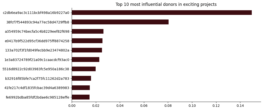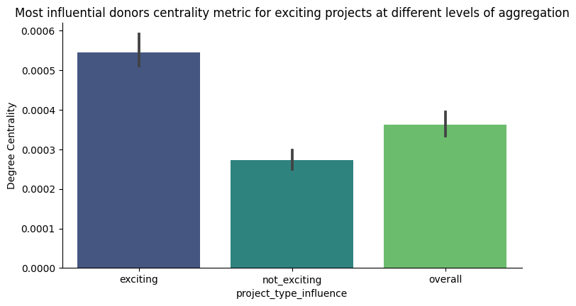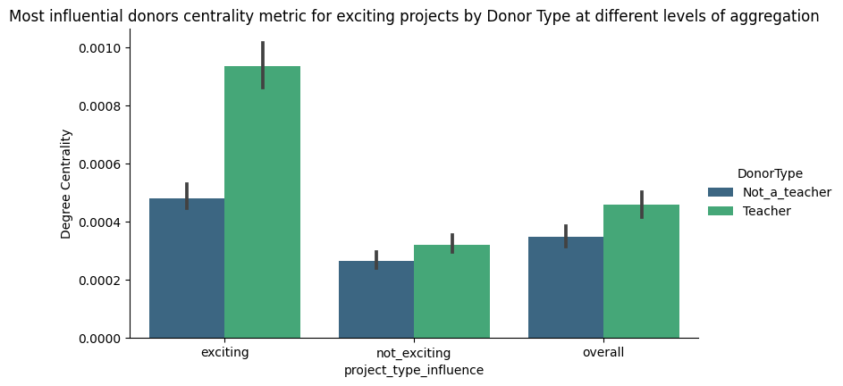 For the overall case, exciting projects exercise an improving effect on the centrality metric. Even more, by complementing information from a tabular analysis we can keep adding dimensions into the analysis and draw interesting knowledge, such is the case of donors that are also teachers, a fact reflected in the centrality metric as well: